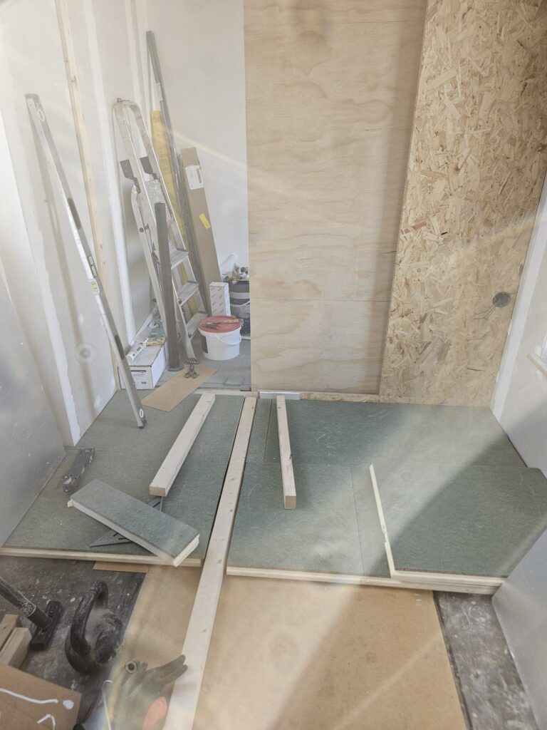 Hier hebben we eigenlijk hetzelfde als beneden gedaan. We hebben de vloer eerst egaal gemaakt en daarna beloopbare PIR platen gelegd. Dit voor zowel isolatie als een solide ondervloer.