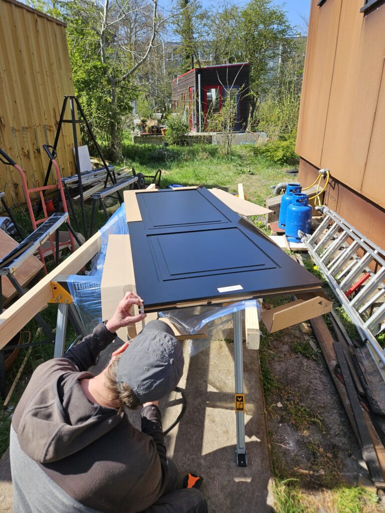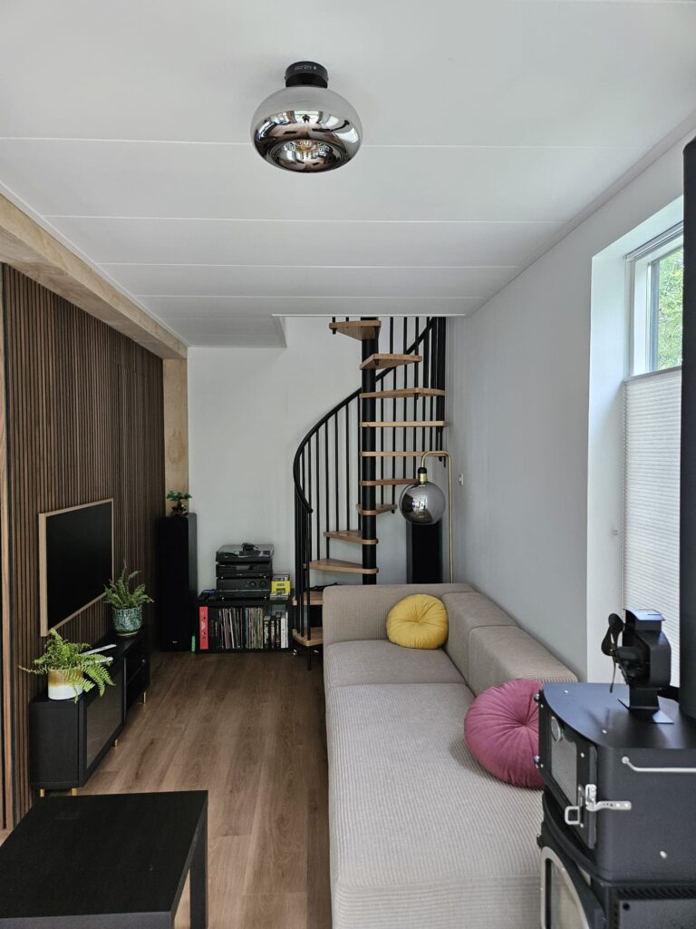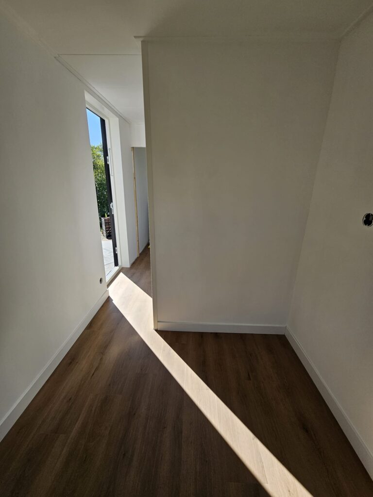 De bovenverdieping willen we afsluiten van beneden met een schuifdeur die in de muur verdwijnt. De deur heeft meerdere praktische voordelen. Ten eerste blijft de warmte beter beneden hangen, maar daarnaast hebben we katten die we niet in de slaapkamer willen hebben. Het railsysteem hadden we al een tijdje binnen en uiteindelijk was ook de deur binnen gekomen. In de deur moest nog een sluif ingefreesd voor het schuifsysteem. De tussenmuur hadden we nog half opengelaten zodat we de deur en het railsysteem konden installeren. Al met al nog een flinke klus, maar opnieuw zijn we super tevreden met het resultaat.