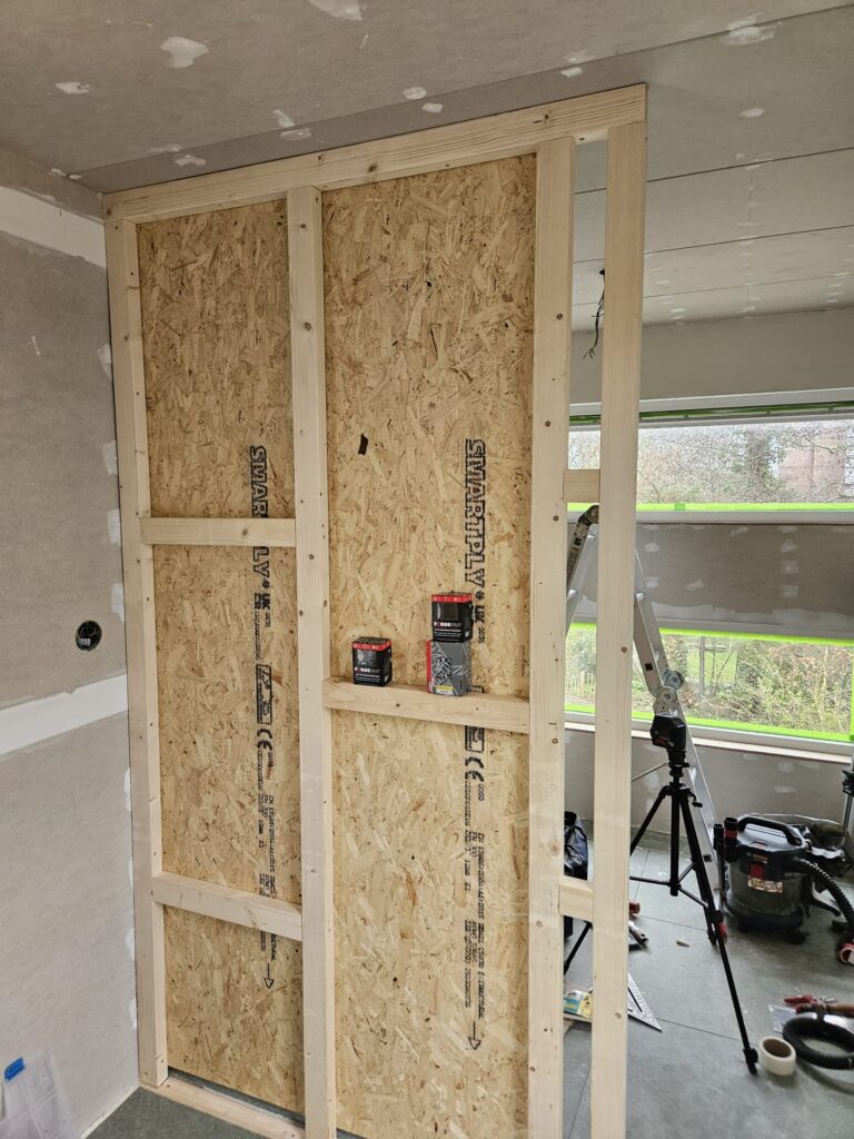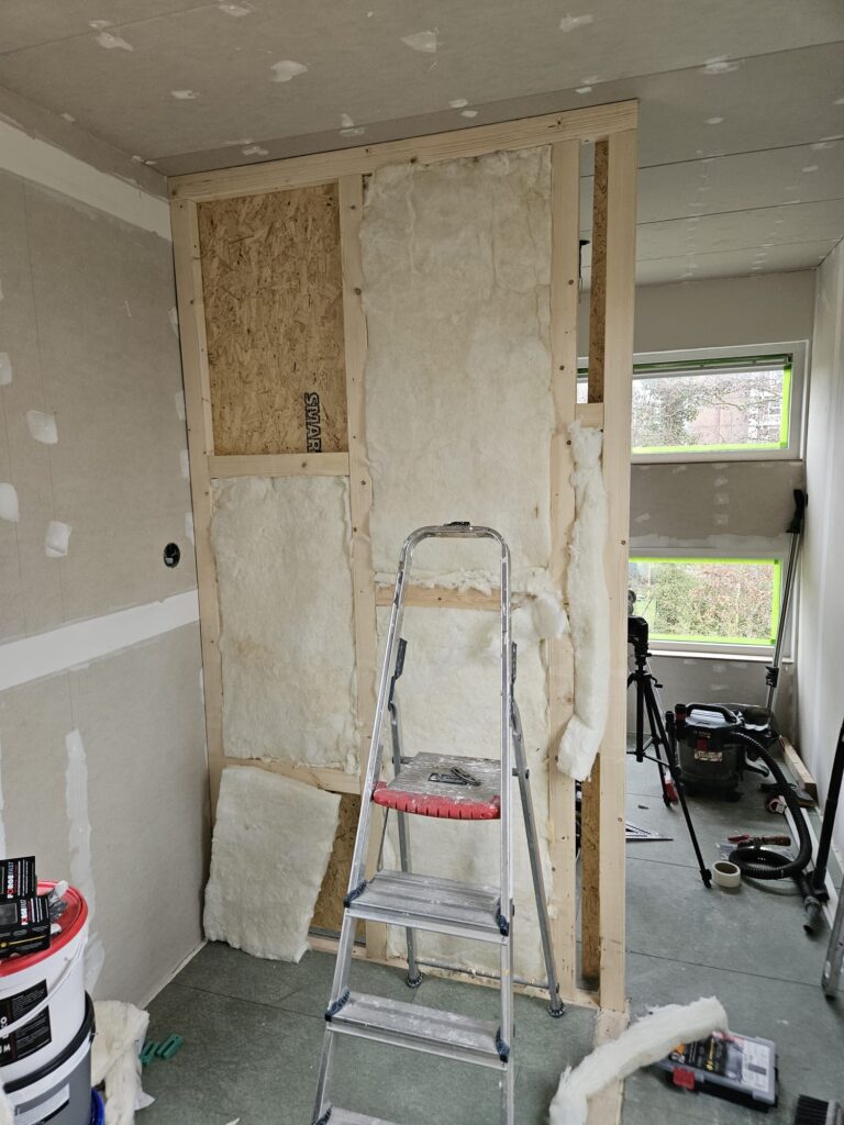 De bovenverdieping zou in eerste instantie één grote ruimte worden. Maar soms veranderen dingen en moet je na gaan denken over de toekomst en wellicht een tweede kamer. Dat was nog best een breinbreker hoe daar uberhaupt een tweede kamer in te verwerken, maar het is gelukt. Voor nu hebben we alleen een tussenmuur gebouwd maar wel met een basis op de vloer waar we later nog een muur kunnen bouwen.