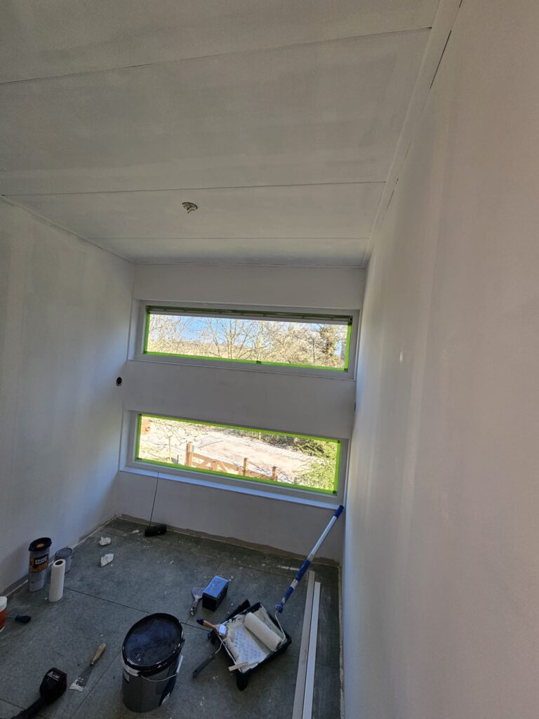 Op de benedenverdieping hebben we eerst vliesbehang aangebracht voordat we gingen schilderen. We vonden dat zelf niet zo’n heel groot succes, daarom zijn we boven eigenlijk na het afsmeren direct op de platen gaan schilderen. Na 3 lagen zag het er prima uit. En meteen weer een ander gezicht.